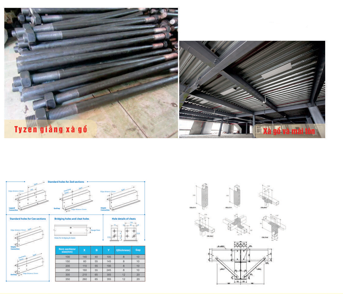 Chi tiết lỗ tiêu chuẩn cho xà gồ Z & C: Lỗ bu lông được khoan tại vị trí liên kết và bản mã vị trí chồng và ở các điểm giằng.
